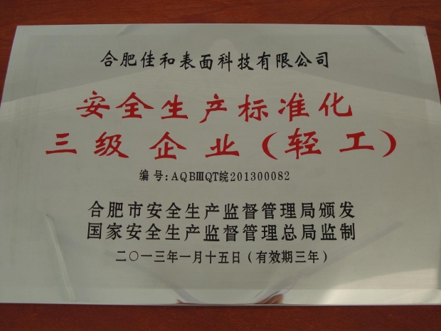 熱烈祝賀合肥佳和表面科技有限公司順利通過安全生產(chǎn)三級(jí)企業(yè)認(rèn)證